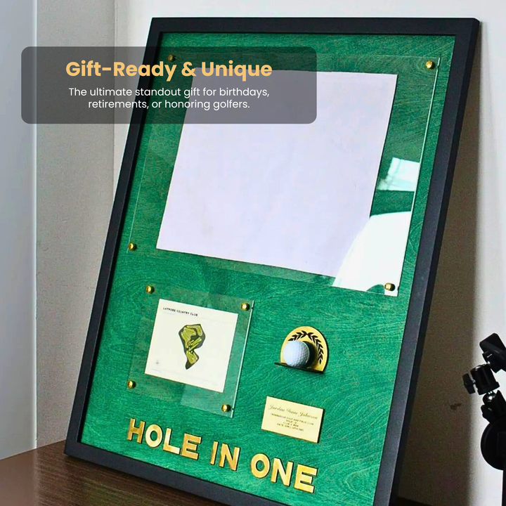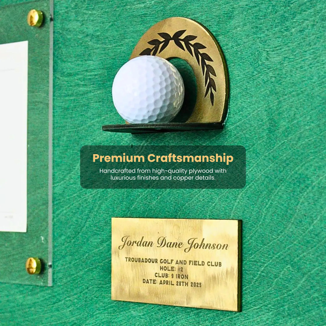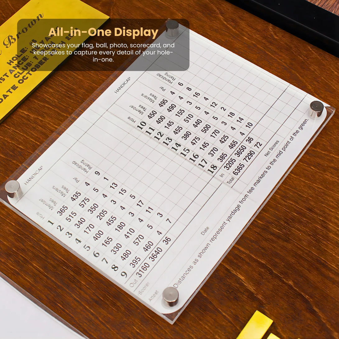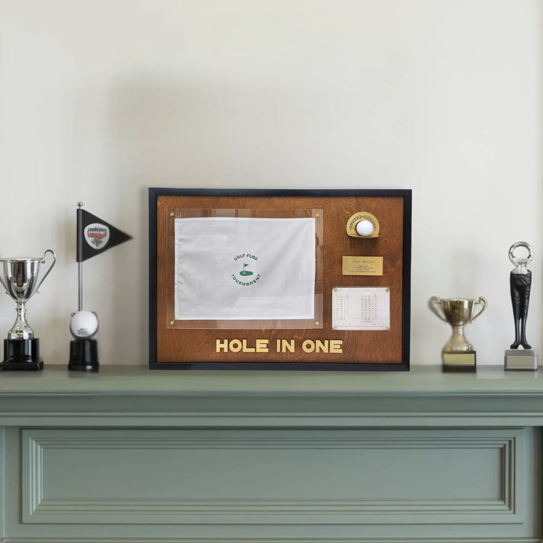 Picture your actual hole-in-one flag proudly mounted alongside your scorecard and ball—creating a trophy that makes every visitor stop in their tracks. Our premium hole-in-one flag display transforms your once-in-a-lifetime achievement into a museum-quality centerpiece that commands respect and sparks endless conversations about your perfect shot.