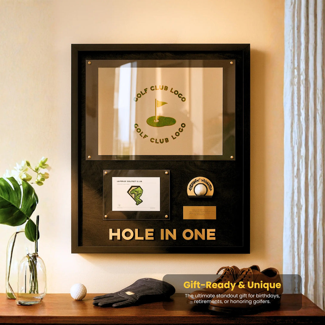 Picture your actual hole-in-one flag proudly mounted alongside your scorecard and ball—creating a trophy that makes every visitor stop in their tracks. Our premium hole-in-one flag display transforms your once-in-a-lifetime achievement into a museum-quality centerpiece that commands respect and sparks endless conversations about your perfect shot.