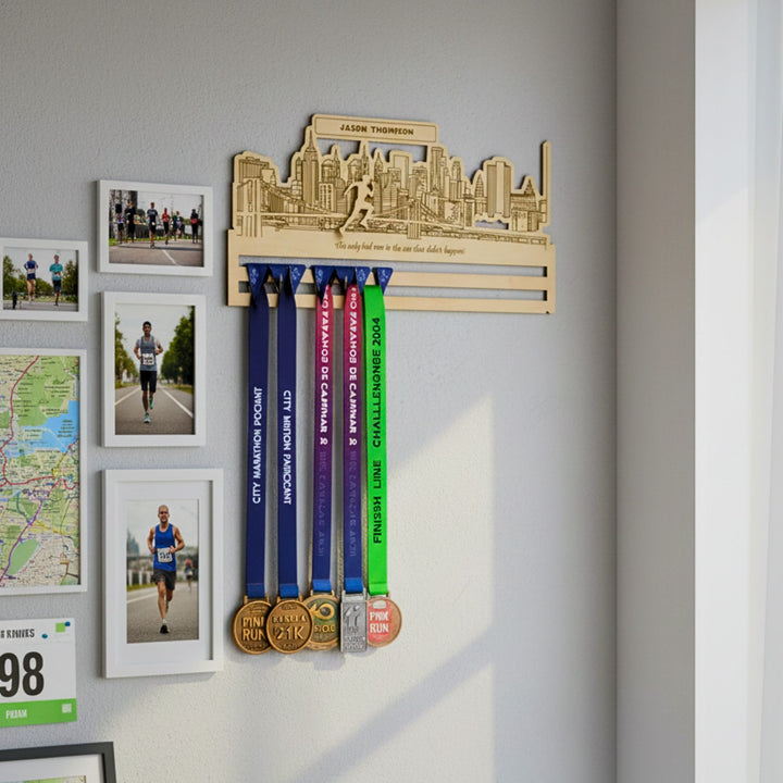 This handcrafted medal holder is designed to honor every leg of your journey.