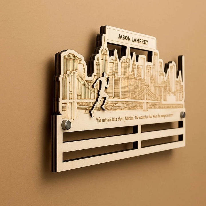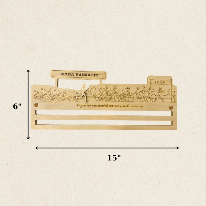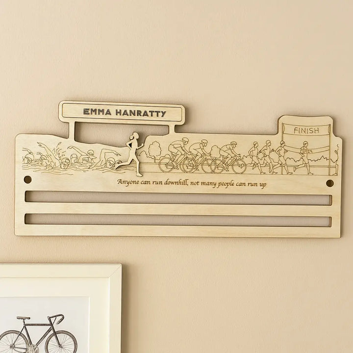 It’s not just a place to hang your medals; it's a personal storyboard of your achievements. The detailed laser-engraved scene captures the motion of the swim, bike, and run, all leading to the finish line. It's a daily reminder of your determination and the perfect, meaningful gift for the triathlete in your life.